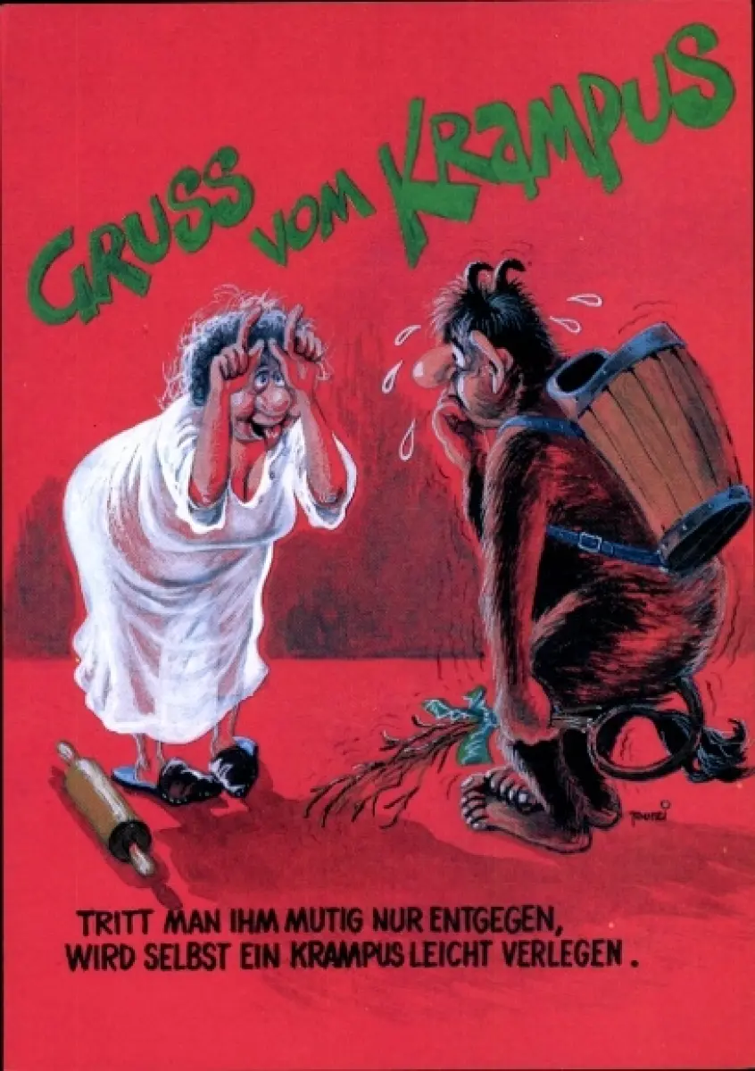 Ak Krampus, Frau mit Teigrolle, Trauriger Teufel