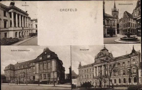 Ak Krefeld am Niederrhein, Rathaus, Schwanenmarkt, Hauptpost, Höhere Töchterschule