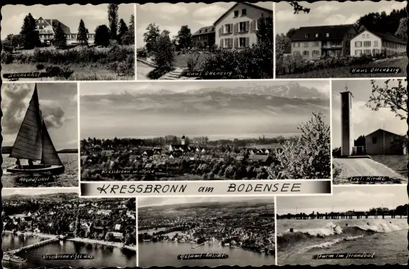 Ak Kressbronn am Bodensee, Panorama vom Ort, Segelboot, Sturm im Strandbad, Haus Ottenberg