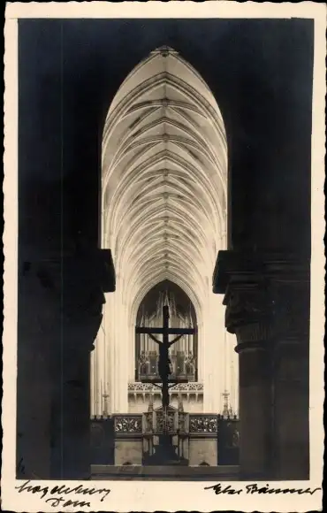 Ak Kreuzhorst Magdeburg, Innenansicht einer gotischen Kirche mit Altar, Kreuz und Kerzen.
