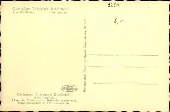 Ansichtskarte, Postkarte, Talsperre, Stausee, Staudamm, Staumauer, Gasthof