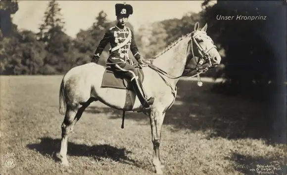 Ak Kronprinz Wilhelm in Husarenuniform, Porträt zu Pferde