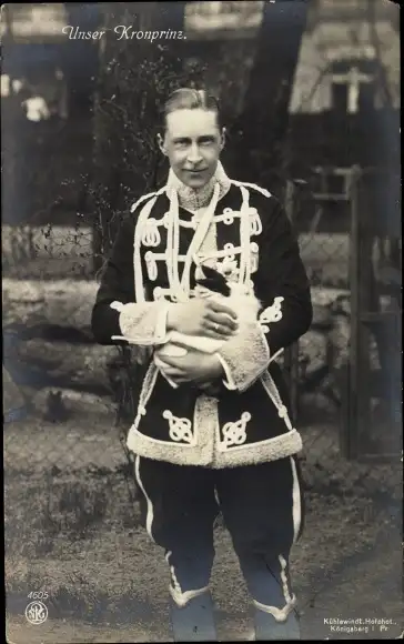 Ak Kronprinz Wilhelm von Preußen, Portrait in Husarenuniform mit Hasen, NPG 4605