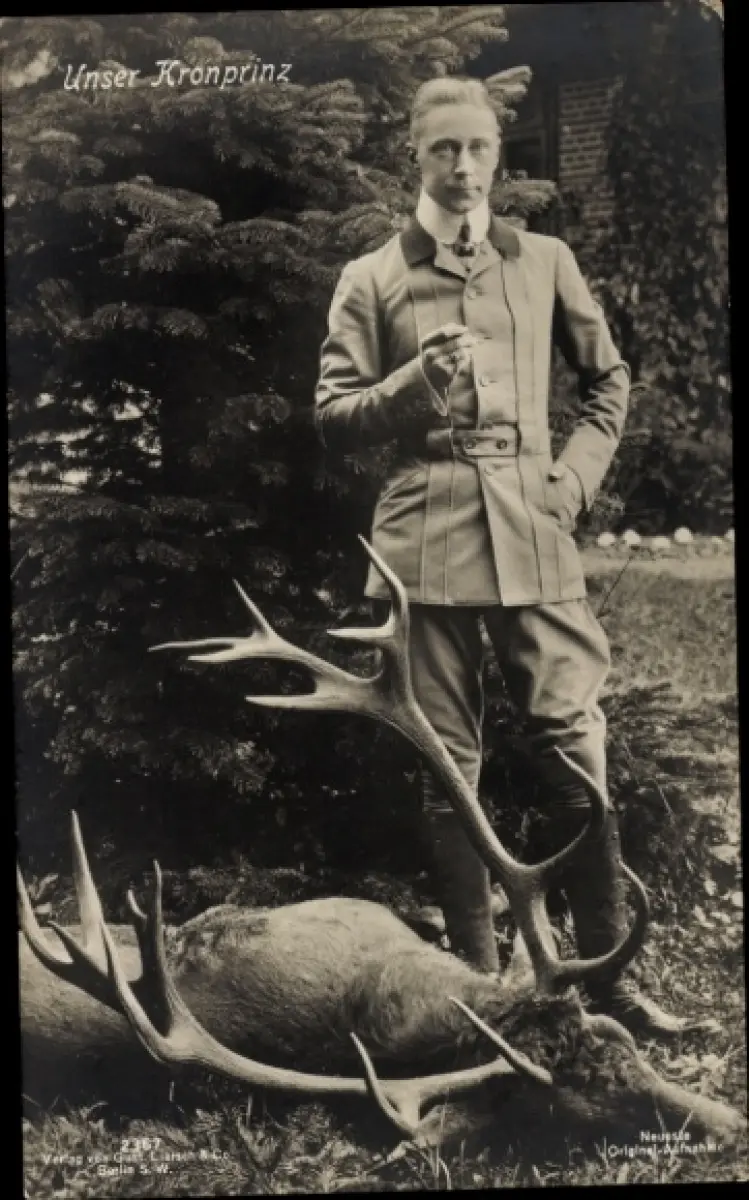 Ak Kronprinz Wilhelm von Preußen auf der Jagd, Portrait mit erlegtem Hirsch