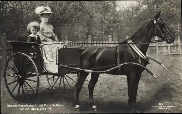 Ak Kronprinzessin Cecilie von Preußen mit Prinz Wilhelm auf der Spazierfahrt, Pferdekutsche