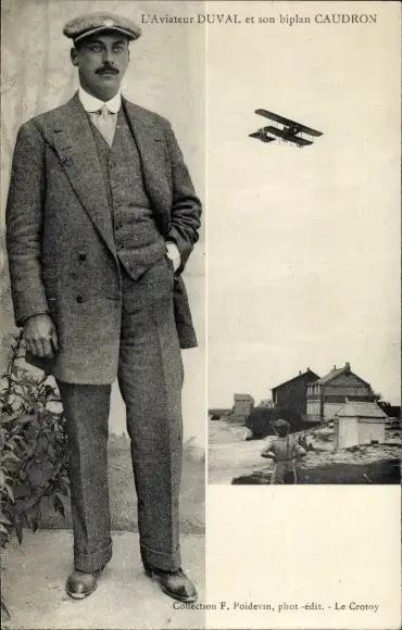 Ak L'Aviateur Duval et son biplan Caudron, Flugpionier, Flugzeug