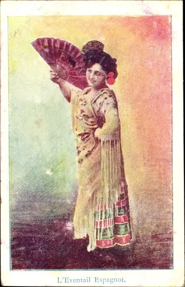 Ak L'Eventail Espagnol, Frau in spanischen Trachten, Fächer