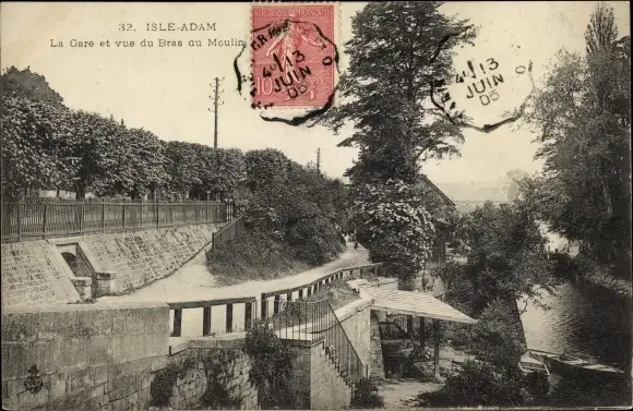 Ak L'Isle Adam Val d’Oise, La Gare et vue du Bras du Moulins