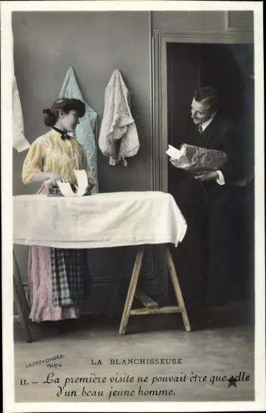 Ak La Blanchisseuse, Frau beim Bügeln
