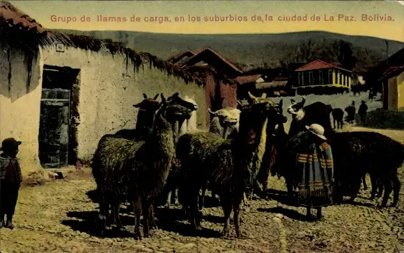 Ak La Paz Bolivien, Lamas auf der Straße im Vorort der Stadt