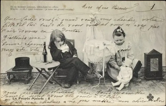 Ak La Poupee Malade, Junge und Mädchen mit Puppe