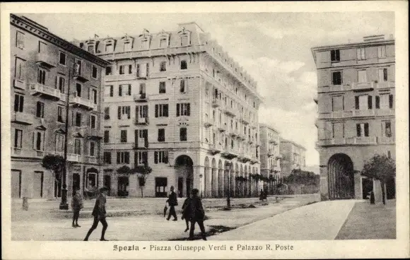 Ak La Spezia Liguria, Piazza Giuseppe Verdi e Palazzo R. Poste