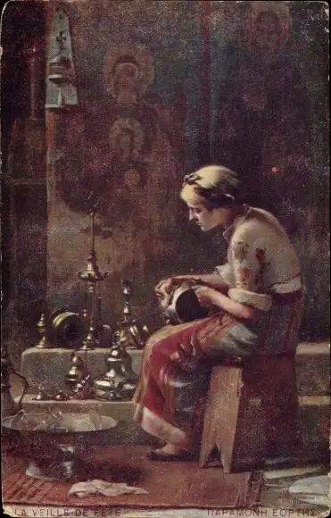 Ak La Veille de Fete, Frau in griechischer Tracht putzt Silbergeschirr