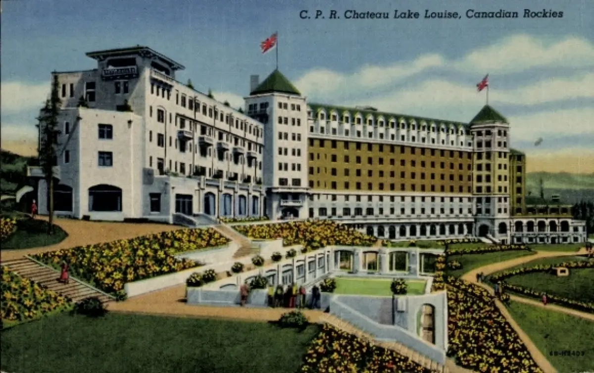 Ak Lake Louise Alberta Kanada, C. P. R. Chateau Lake Louise, Gebäude, Blumenbeete, Flaggen