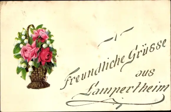 Ak Lampertheim am Rhein Hessen, Blumenkorb, Rosen, Maiglöckchen
