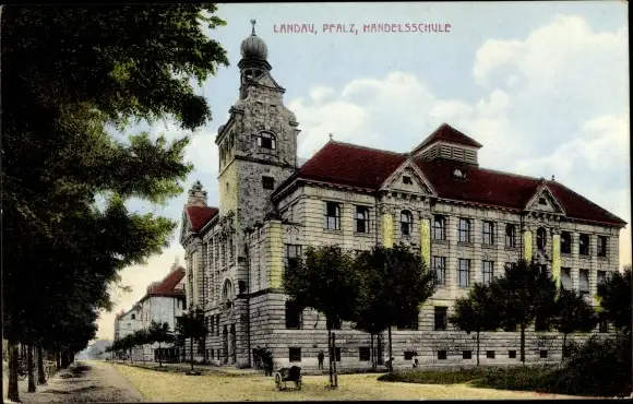 Ak Landau in der Pfalz, Straßenpartie an der Handelsschule