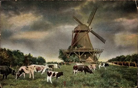 Ak Landschaft mit Rinderherde und Windmühle