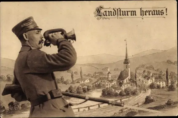 Ak Landsturm heraus, Soldat in Uniform mit Trompete, Bajonett, Blick auf eine Stadt