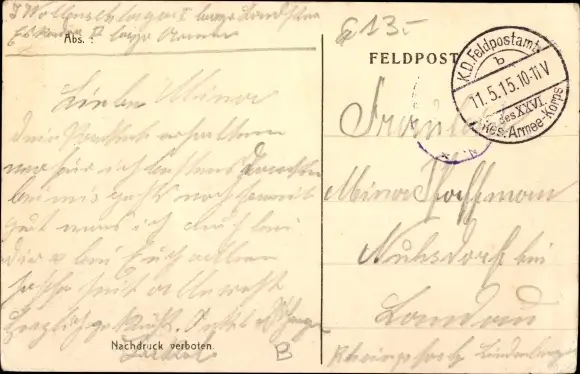 Zustand, siehe Scan, gelaufen, 1915- K. D. Feldpostamt des XXVI. Res. Armee Korps - ca 14 cm X 9 cm