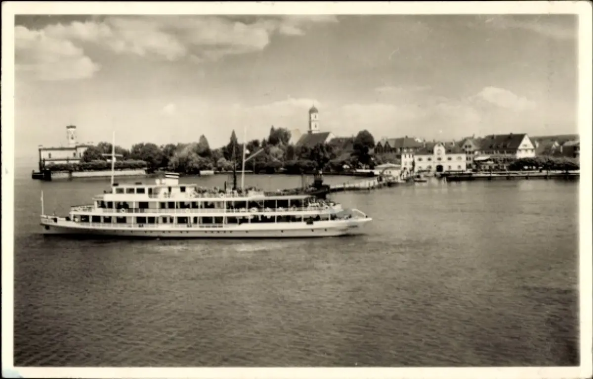 Ak Langenargen am Bodensee, Schiff auf dem Bodensee, Ufer mit Gebäuden, Wolken am Himmel