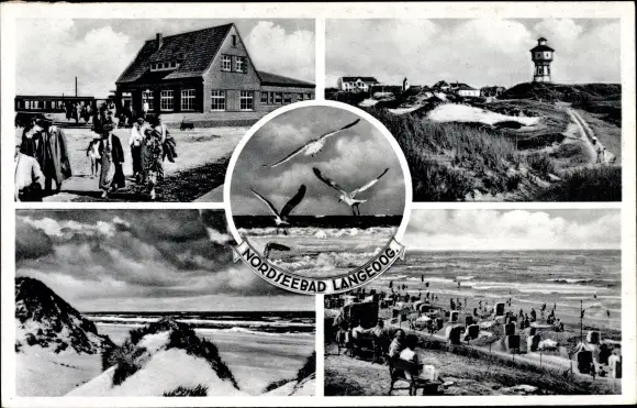 Ak Langeoog in Niedersachsen, Teilansichten, Strand, Dünen, Möwen