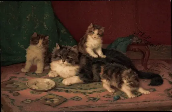 Ak Langhaarige Katzenmutter mit Kindern, Tellerr