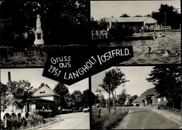 Ak Langholt Leer in Ostfriesland, Denkmal, Schwimmbad, Straßenansicht
