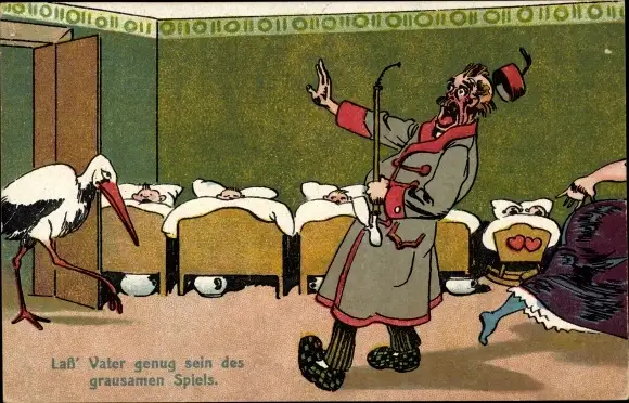 Ak Lass Vater genug sein des grausamen Spiels, Storch, Babys