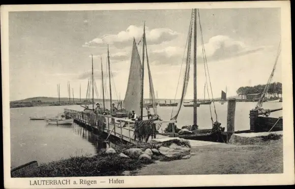 Ak Lauterbach Putbus auf Rügen, Blick zum Hafen, Segelboote, Steg