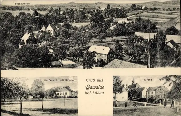 Ak Lawalde in der Lausitz, Schule, Kirche, Totalansicht