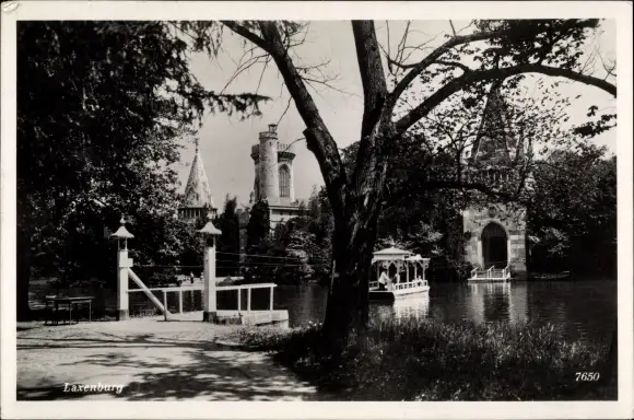 Ak Laxenburg in Niederösterreich, Partie am Wasser, Anleger, Seilfähre, Türme