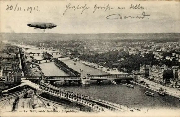 Ak Le Dirigeable Militaire La Republique, Zeppelin über einer Stadt