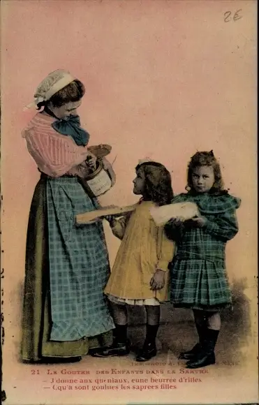 Ak Le Gouter des Enfants dans la Sarthe, Frau und Mädchen in französischen Trachten