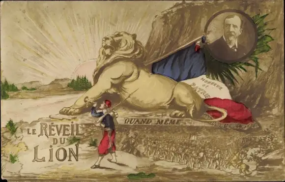 Ak Le Reveil du Lion, Quand Meme, Löwe, Portrait eines Mannes, Propaganda Frankreich