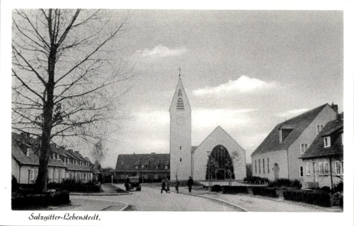 Ak Lebenstedt Salzgitter in Niedersachsen, Kirche, Straßenpartie
