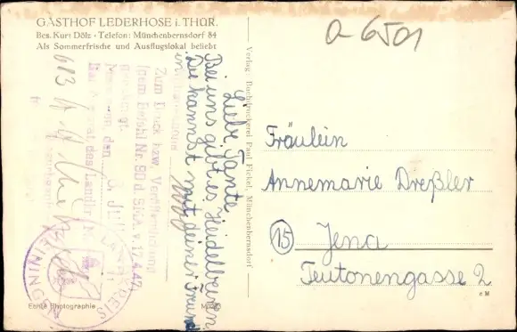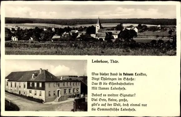 Ak Lederhose in Thüringen, Gasthof Lederhose, Totalansicht, Gedicht