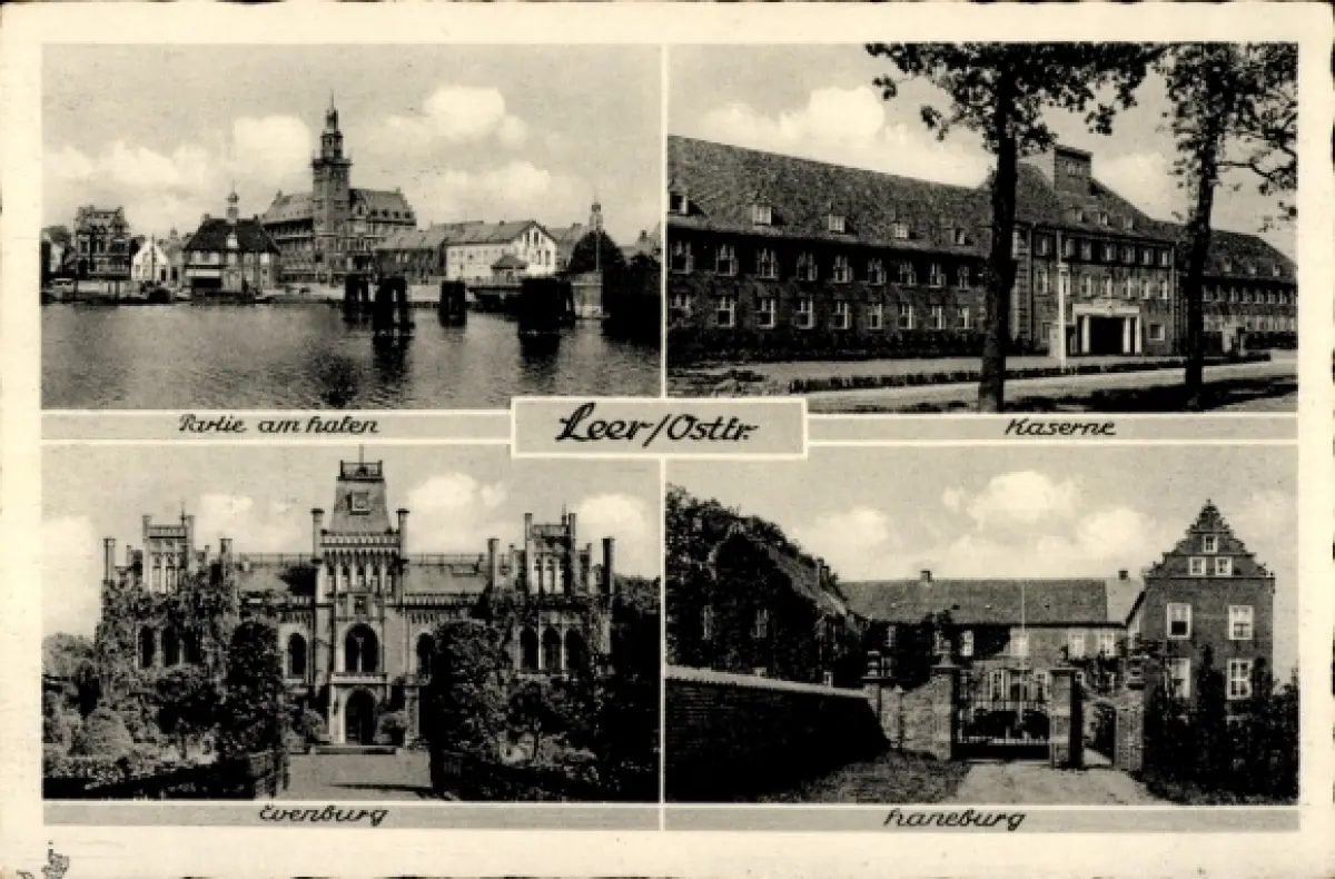 Ak Leer in Ostfriesland, Hafen, Kaserne, Evenburg, Haneburg