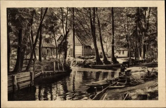 Ak Lehde Lübbenau im Spreewald, Ortspartie, Kahn