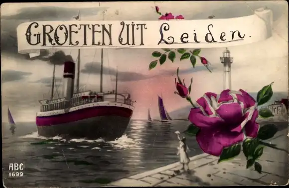 Ak Leiden Südholland Niederlande, Dampfer sticht in See, Leuchtturm, Rose