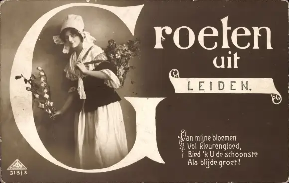 Ak Leiden Südholland Niederlande, Frau in Tracht, Grüße aus