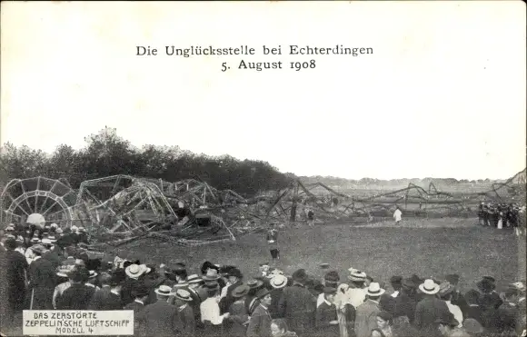 Ak Leinfelden Echterdingen auf den Fildern, Abgestürztes Zeppelin'sches Luftschiff Modell 4 1908