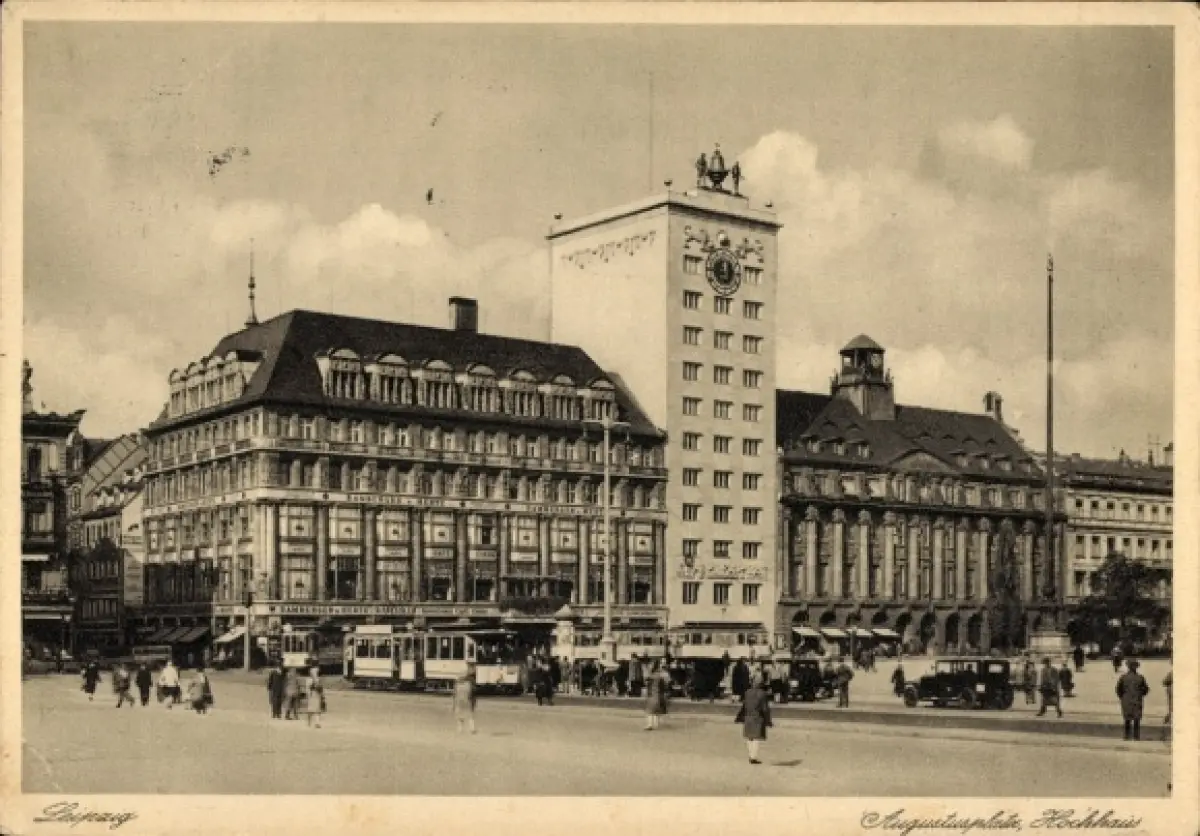 Ak Leipzig, Augustusplatz, Hochhaus, Straßenbahn, Menschen, Autos