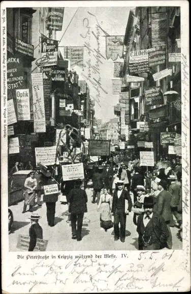 Ak Leipzig, Peterstraße während der Messe, Reklame, Plakate