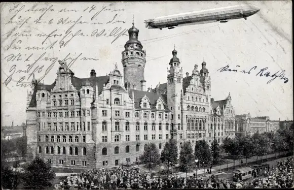 Ak Leipzig, Zeppelin über dem Rathaus, Schaulustige