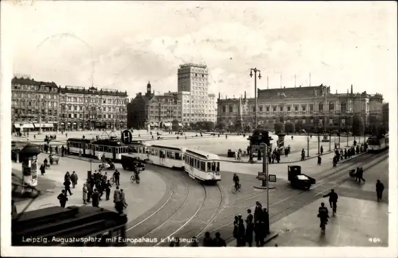 Ak Leipzig in Sachsen, Augustusplatz, Europahaus, Museum, Tram