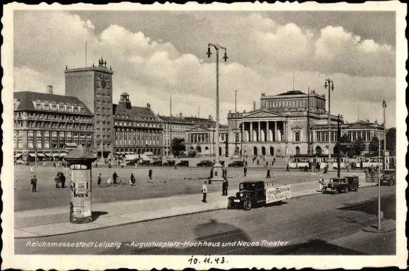 Ak Leipzig in Sachsen, Augustusplatz, Hochhaus, Neues Theater, Straßenbahn, Litfaßsäule