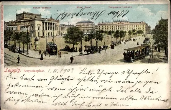 Ak Leipzig in Sachsen, Augustusplatz, Neues Theater, Hotel Royal, Hauptpost-Gebäude