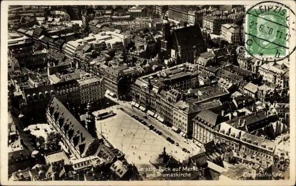 Ak Leipzig in Sachsen, Fliegeraufnahme Marktplatz und Thomaskirche