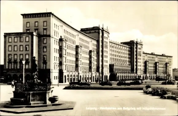 Ak Leipzig in Sachsen, Neubauten am Roßplatz, Mägdebrunnen