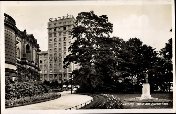 Ak Leipzig in Sachsen, Partie am Europahaus, Statue